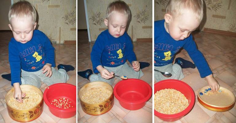 Максимка тут же начал во всём синем ковыряться, изучать, а я пошла варить ему кашу. Пока варила, подсыпала ему в тазик еще и фасолинки и дала ложку, чтобы было чем заняться - попересыпать, поиграть