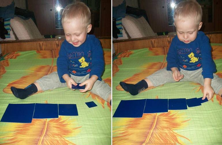 раскладывали синие квадратики по убыванию. Кстати, в первый раз сам разложил, еще и правильно!