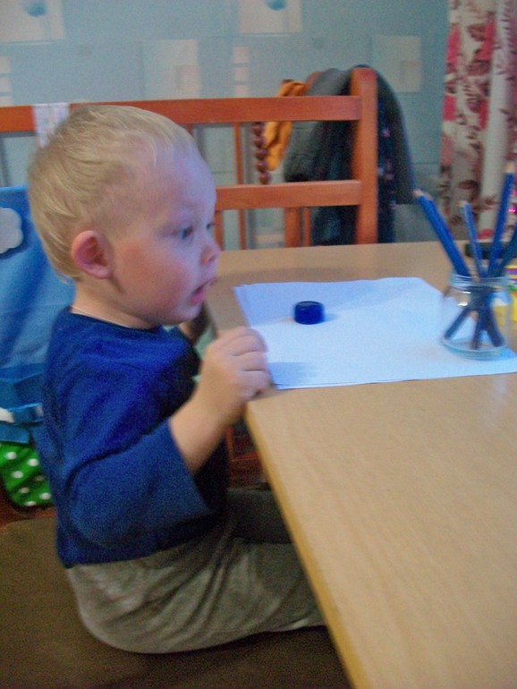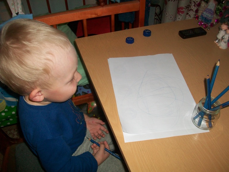 После прогулки, обеда и дневного сна сели мы рисовать карандашами. Так ребенок был просто в шоке, когда увидел, что вместо обычных цветных карандашей все карандаши были синими