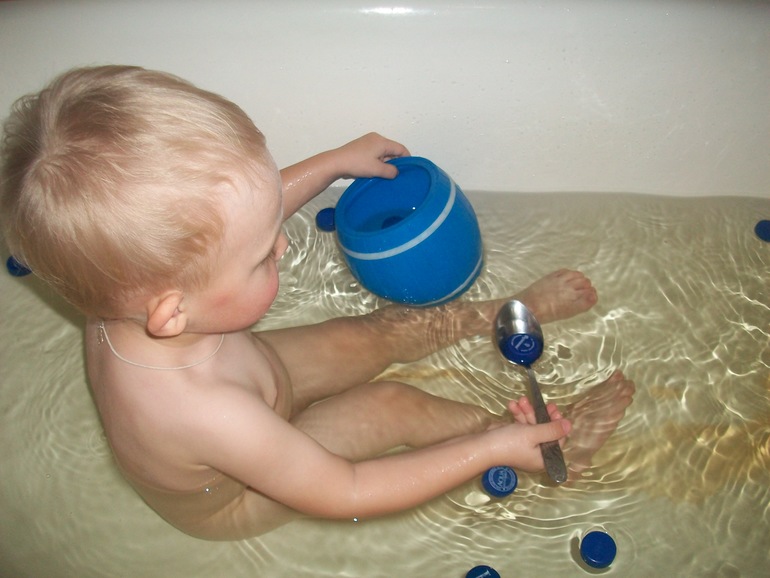 Потом довольный залез в воду. Я дала ему синюю бочку и ложку, объяснила, что ложкой