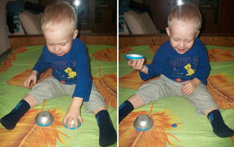 искали синий камушек под одинаковыми тарелочками: я прятала и крутила-переставляла тарелочки туда-сюда, а Максим следил и потом угадывал, где камушек