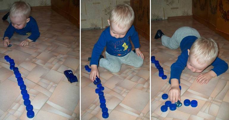 А как позавтракали, стали строить синюю дорожку из крышек от бутылок и пустили по ним машинки катать. Дорожка маленькая, машинкам ехать тяжело, маленькая машина всю дорожку разломала