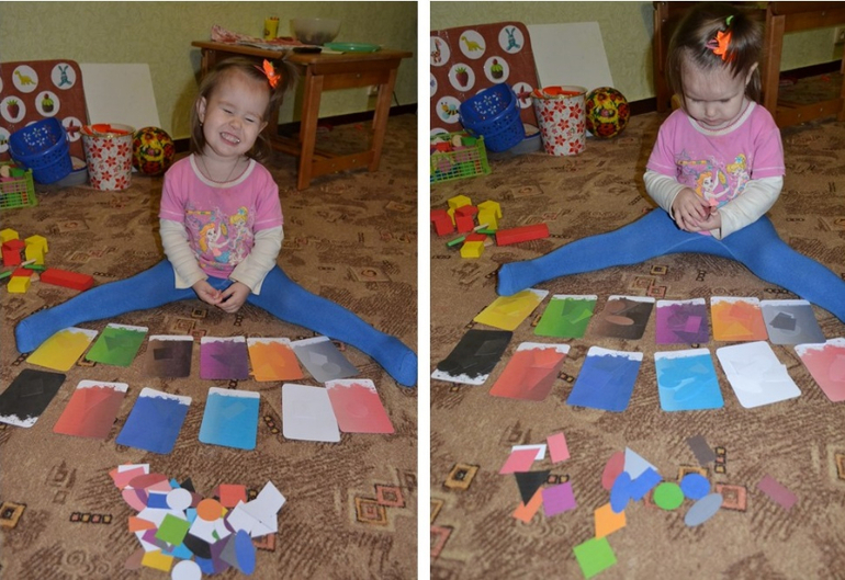 9. К карточкам цветов от Лизы сделала фигуры, по 5 фигур на каждую карточку. И цвет, и фигуры повторяем, сортируем.