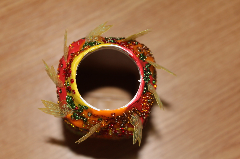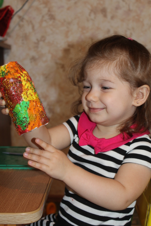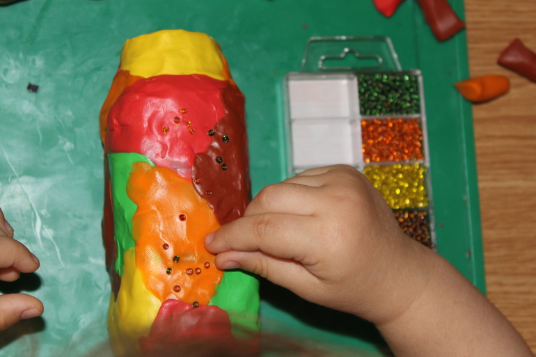 Настена размазала пластилин только по одной стороне коробочки, остальные стороны сама доделала, а вот бисер с огромным удовольствием вдавливала в пластилин, отличное развитие моторике, в том числе и для мамы))) Вот что вышло.
