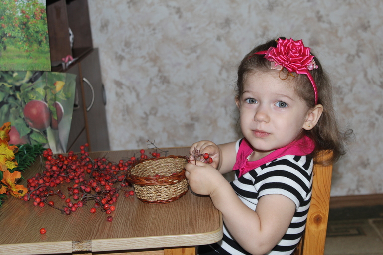 Еще мне очень хотелось этой осенью показать дочке как делаются бусы из рябины, но вовремя мы ее не набрали, помог папа, привез из деревни нам увядающие ягодки. Настена требовала дать ей иголку, но я все время боялась, что она наткнется, так что договорились, что я ягодку протыкаю иголкой, а Настена тянет ее по ниточке. Зимой пойдем развешивать рябиновые бусы на деревья для птичек)