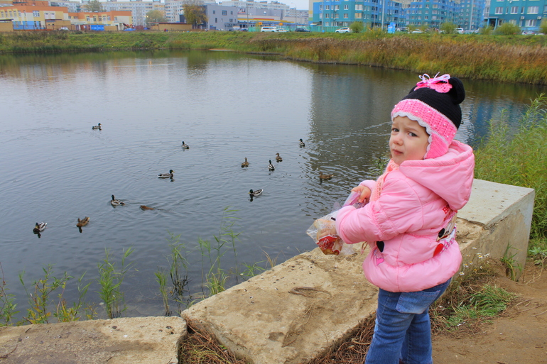 Очень любим ходить на озеро возле дома, у нас там живут утки и андатра, мы их кормим хлебом)