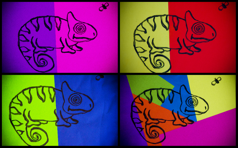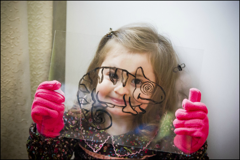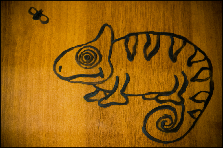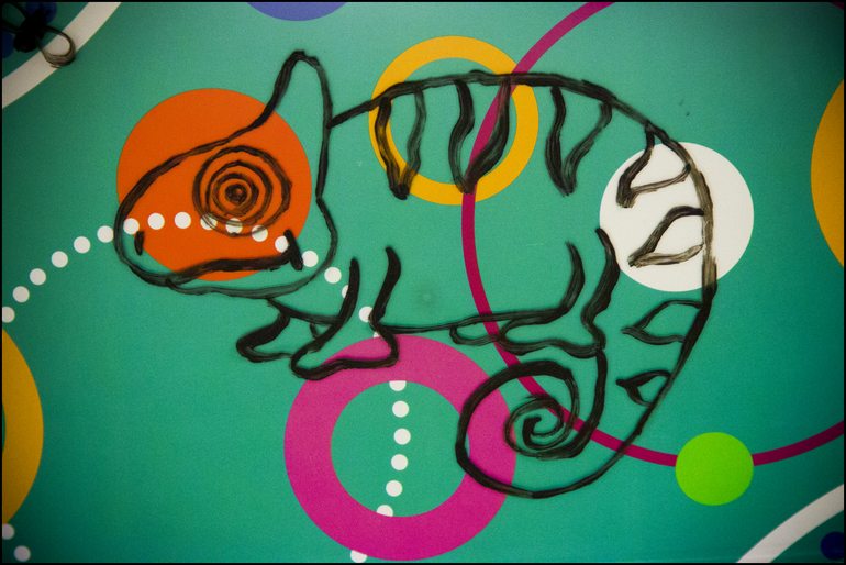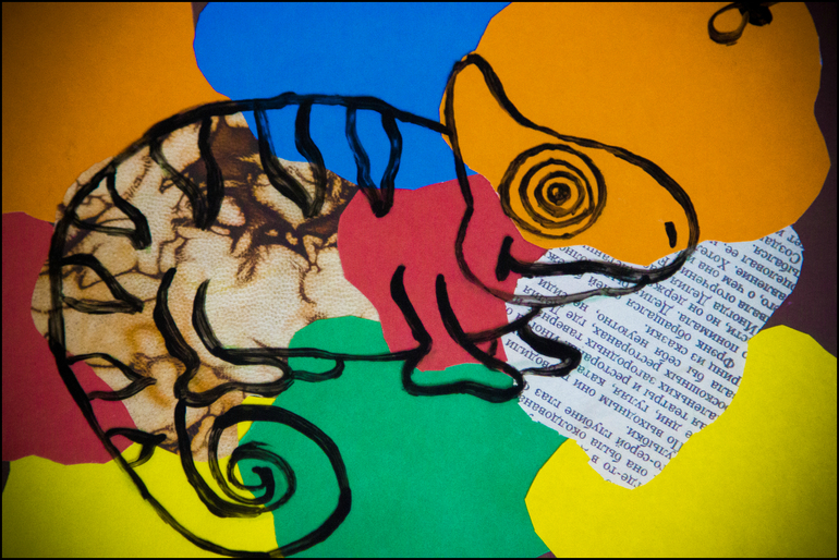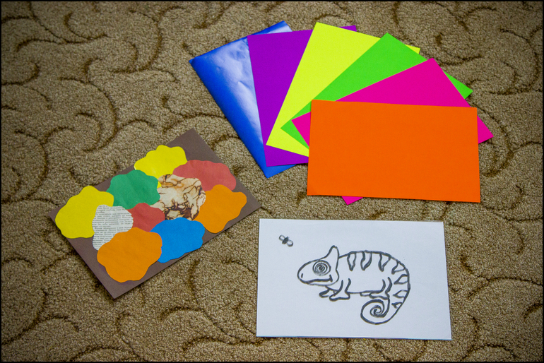 Я нарисовала на стекле хамелеона. Обычной краской. Но можно, наверное, нарисовать на файле (безопаснее - точно) или на прозрачной пластмассе…