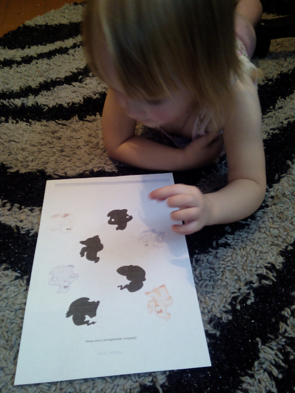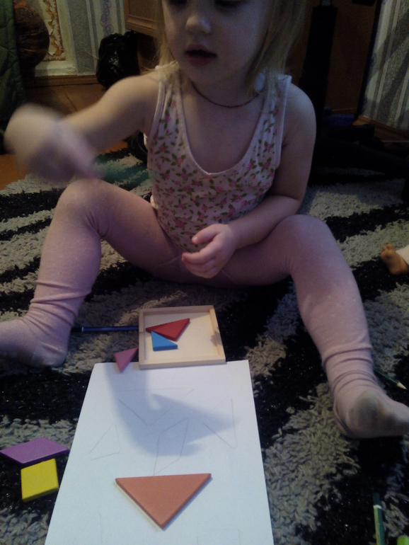 6.Танграм.Обычно мы выкладываем картинки,но я забыла распечатать и пришлось просто обвести фигуры.Настена быстро справляется с заданием.