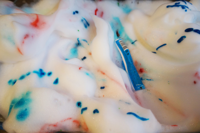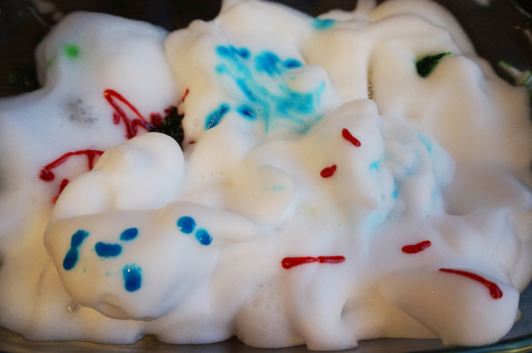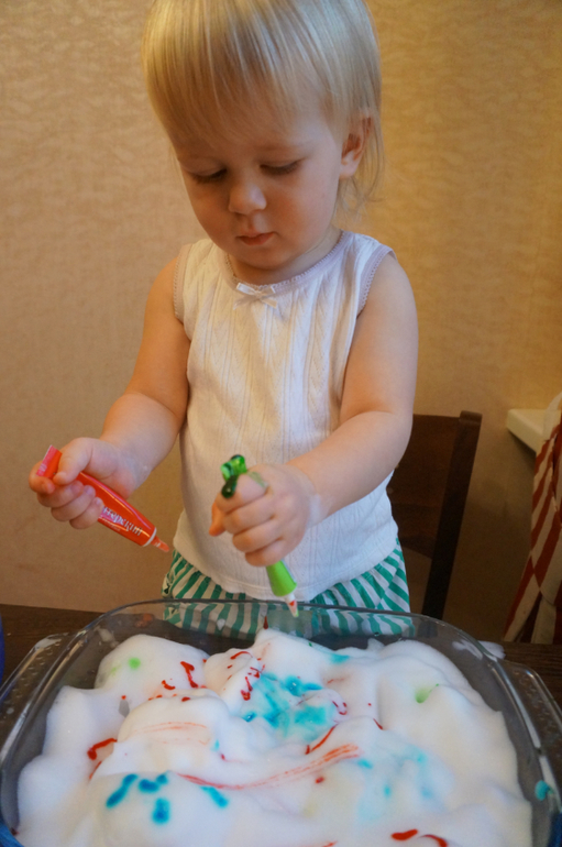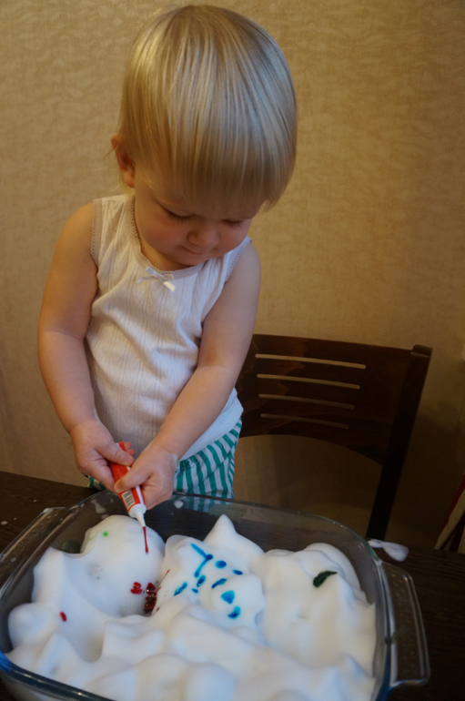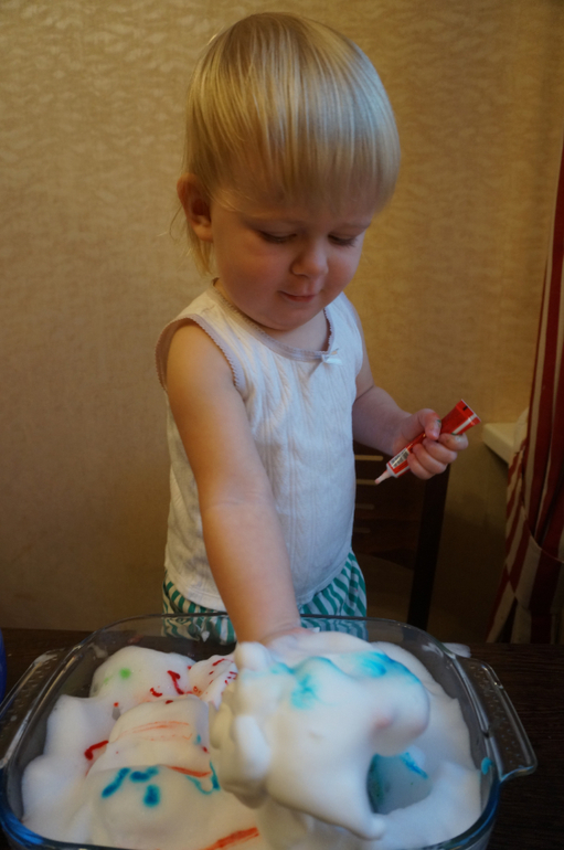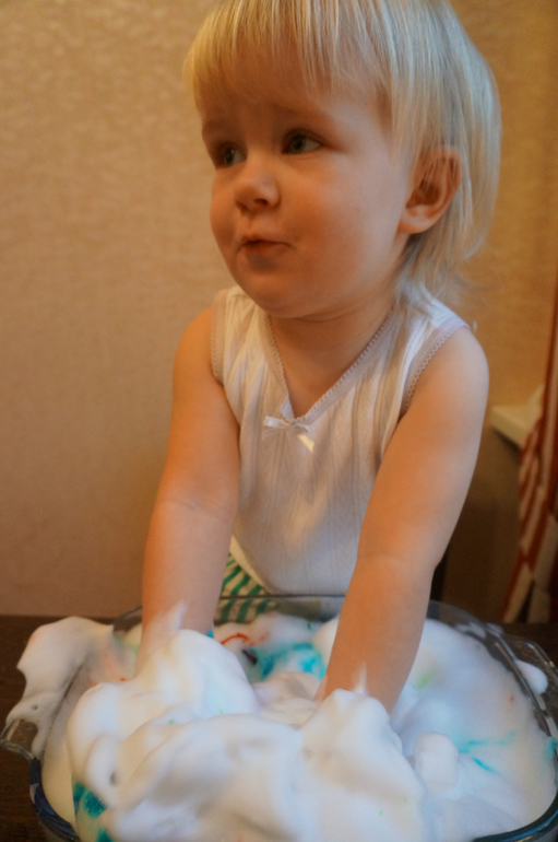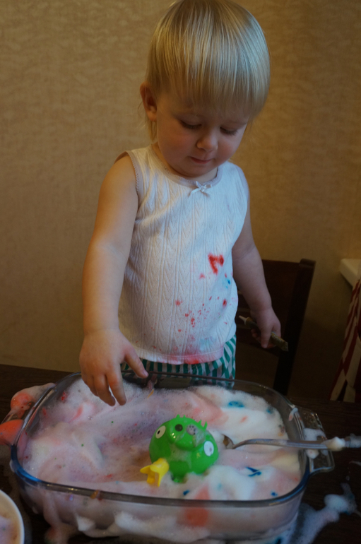 Развитие детей второго года жизниЛетом мы с Машей как-то играли с пеной для бритья, а теперь решили испробовать пенку для волос в сочетании с гелиевыми пищевыми красителя для выпечки, чтобы посмешивать цвета. Замечу, что пенка для волос более воздушная и негустая, легче смывается и не имеет "мужского" запаха. Я нашла самый дешевый небрендовый вариант в магазине за 30 рублей - красная цена для игры на 1 раз! Маша в восторге развела возню, наливала краски из тюбиков, кормила свинок "кашей", а потом купала их в этом пенном бассейне! Не забудьте, что в таких играх ребенку обязательно нужен таз с водой для промывки рук!