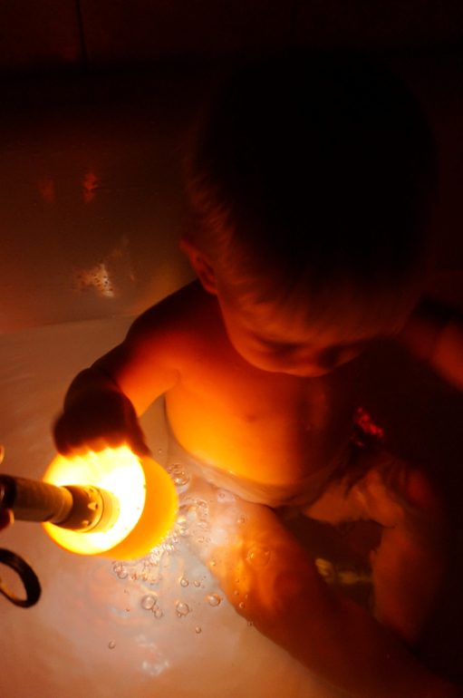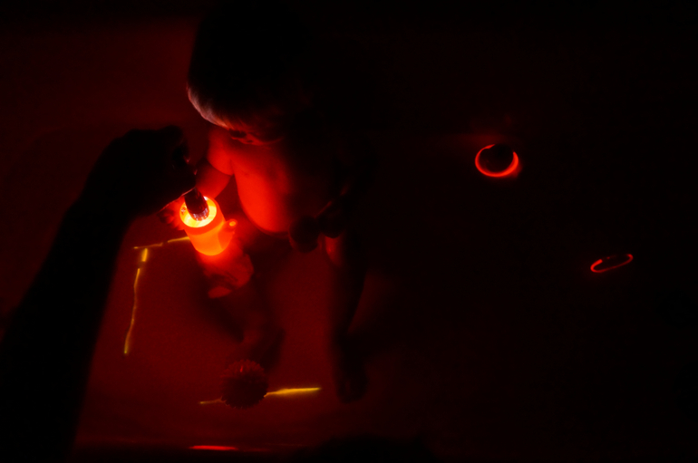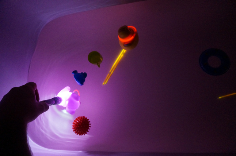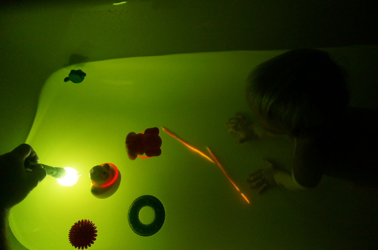 Развитие детей второго года жизниНас с Машей так увлекли неоновые ванны, что мы стали дальше изучать свет, цвет и тени в ванне. Для этого нам понадобился яркий фонарик и разноцветные плавающие игрушки. Мы светили на каждую из них, получая разные цветовые освещения ванны, а при отдалении света на дне появлялись причудливые тени! Завораживает!