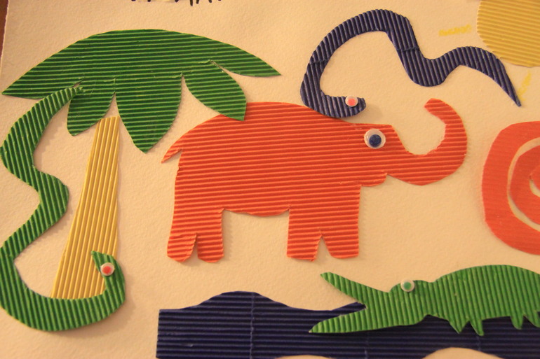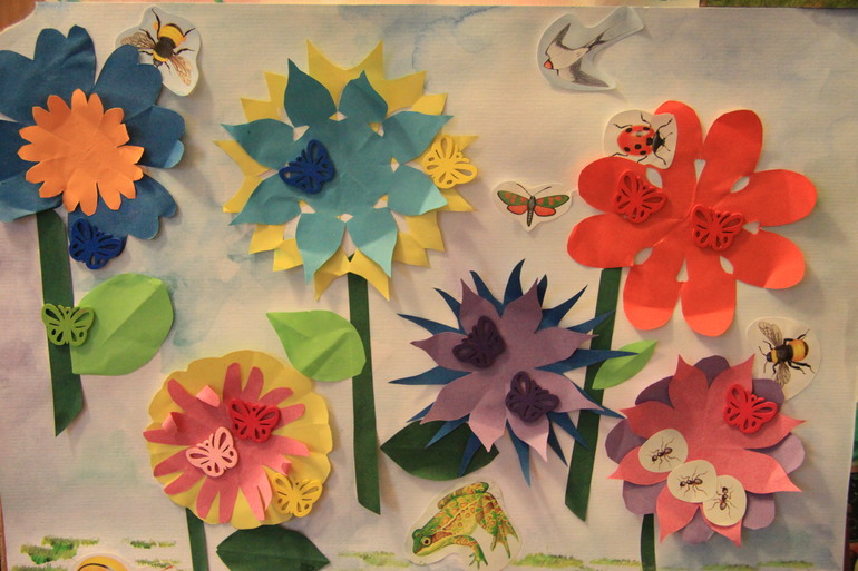 Здесь я постаралась вырезать много разноцветных цветов из цветной бумаги. Фон делали вместе акварелью, потом Ростик выбирал какие цветы куда клеить. Я дала задание приклеить к цветам бабочек одинакового цвета, ну и украсили все наклейками.