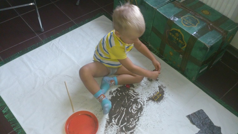 Мы поговорили про то, что есть съедобные растения и несъедобные, что съедобные действительно сушат и перемалывают, только то, что получается из них называется приправой. Дальше детенышу было выдано немного сушеных водорослей..потом еще немного…потом немного сушеной петрушки… и, наконец, некоторое количество прованских трав. Смесь, на мой взгляд, не очень приятная на ощупь, колючая, но Сашино мнение явно не совпадало с моим. Все это снадобье было равномерным слоем распределено по скатерти, на которой мы играли, а потом и по кухне… Что же мы делали.