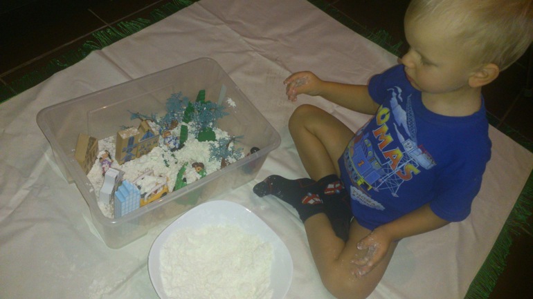 День первый. Игры с крахмалом. Идею подсмотрела где-то давно в сети и у меня уже месяца 3 лежали 5 пачек с крахмалом, а тут еще подарили книгу Аси Ванякиной, где она описывает игру с искусственным снегом, так что решение пришло само собой.