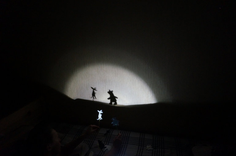 Классический вариант — свет, фигурка, пергаментная бумага и ребено смотрит с другой стороны бумаги, это на мой взгляд. более взрослый вариант. У нас так...свет, фигурка, стена, а маша позади ВСЕГО этого в кроватке...то есть она видит как я оперирую фигурками, но больше смотрит на тень...ну. и я в это время рассказываю какую-то историю.