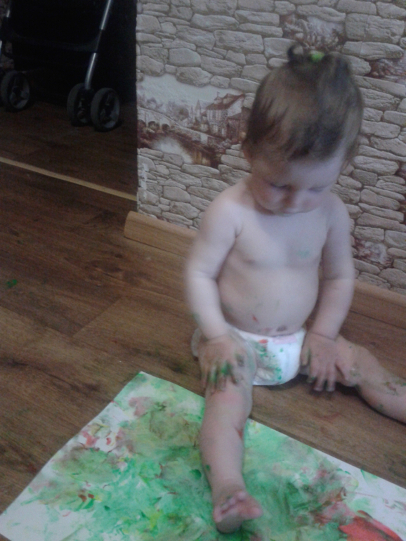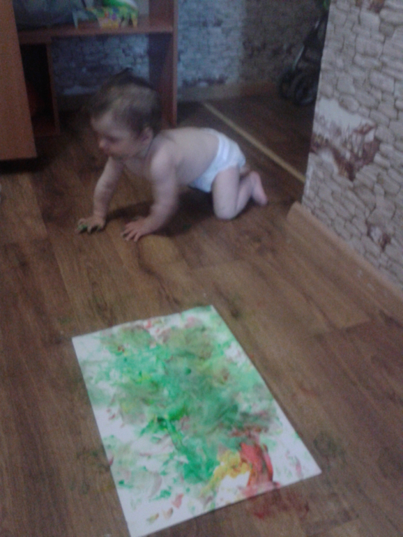 По технике рисования в этом возрасте, я решила предложить ей следующий способ: я на бумагу прямо из баночки наливала немного краски (краска густая) и показывала, что ее (краску) можно размазывать, а так как в этом возрасте что-то размазывать - это любимое занятие,. например, кашу, овощное пюре по столу, то малыш схватывает очень быстро. Катюше понравилось, я только успевала новые порции краски на бумагу наносить, она тут же их смешивала, поползала на бумаге для полного счастья и попробовала краску на вкус. Весь процесс рисование занял минут 5 и мы пошли мыться. Катюшка отправилась отмокать в тазик, а мама тем временем быстро-быстро отклеила первый "шедевр" с пола, вымыла пол от краски и пошла отмывать дочь.))