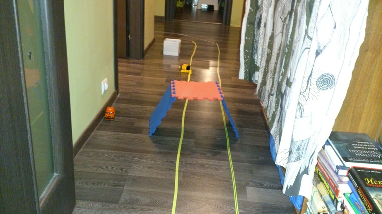Неоднократно видела эту идею на ББ: наклеиваем изолентой контуры дороги и делаем из подручных средств всякие дорожные прибамбасы. Мой ребенок, когда я показала ему дорогу посмотрел на меня глазами, полными восхищения :) мы сделали из картона эстакаду, из конструктора - шлагбаум, из ковриков-паззлов - гараж и тоннель, из коробочки и шнурка от ручки - заправку. Санька минут 20 играл сам, потом начал вовлекать меня. на следующий день они оставались с папой и их игры обросли еще какими-то идеями и сооружениями :)