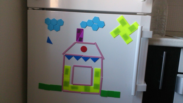 2. "Магнитный конструктор": у меня давным давно лежал набор для счета, купленный когда-то в Метро. В нем были пластмассовые фигурки всех мастей. Лепим на них магнитную ленту - и веселое развлечение для кухни готово. Пока мы играем так: просто складываем фигуру или картину, я делаю фигурку, Саша складывает такую, играем в последовательности. Если знаете какие-то еще игры, буду благодарна за подсказку :)))
