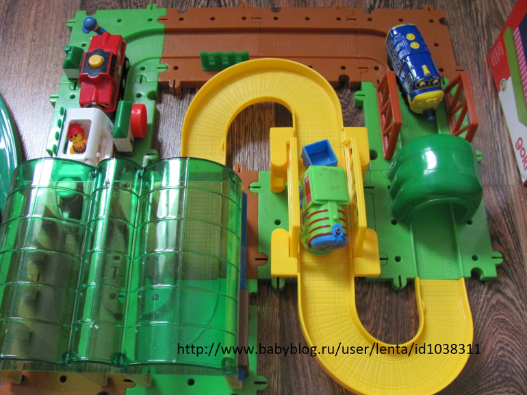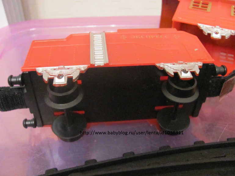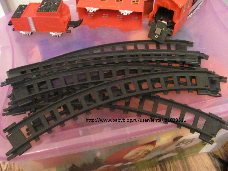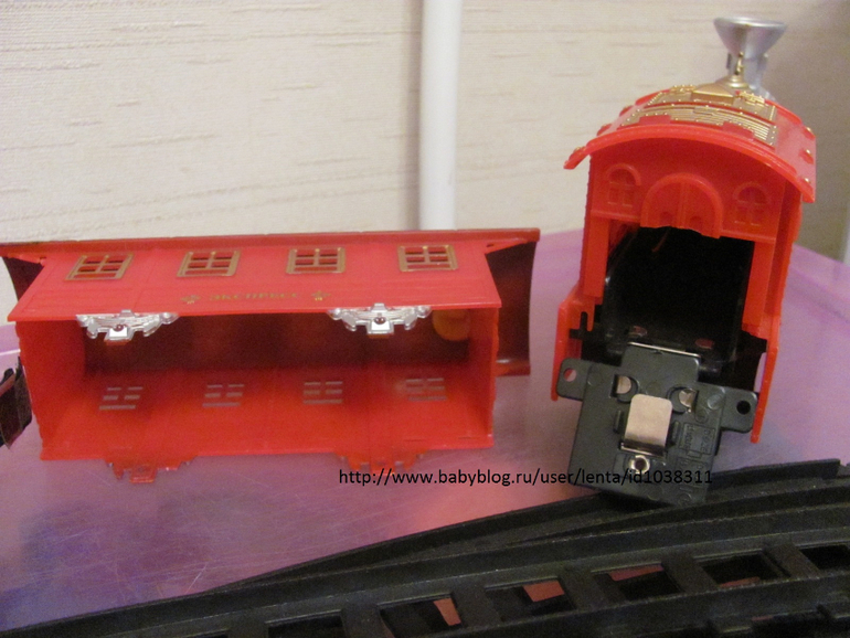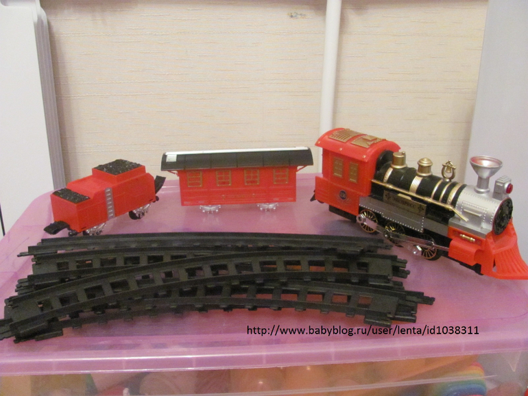 Качество поезда - пластмасса очень низкого качества. Паровоз работает от двух толстых круглых батареек,играл песню, дымил какой-то "фигней" ровно два дня. Потом паровоз упал - соответственно внутри что-то отвалилось видно, и больше паровоз не издавал никаких звуков. Сцепления сломались через неделю активного использования, взамен сделали самодельную сцепку. Колеса и платформа у одного вагона сломались через месяц.