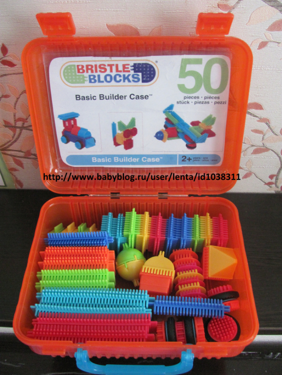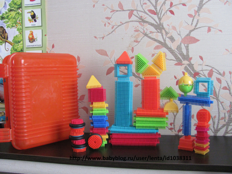 1. Отнесу к этому пункту игольчатый конструктор "Bristle Blocks", у нас набор из 50 деталей в чемодане.