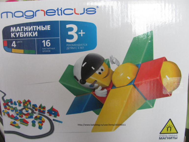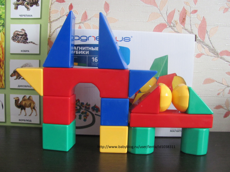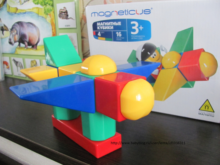 Кубики основных цветов, несколько треугольников. Если например сделать самолет, и полететь - то несколько треугольников отпадут, видно магниты слабые. Ну и причина отсутствия спроса ,наверное, в небольшом количестве, возможно при большом наборе - и постройки были бы большие. Но брать не буду.