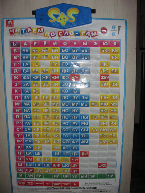 6. Звуковой плакат "Читаем по слогам". Большой размер, приятная озвучка, защита от влаги, регулируется громкость, возможность придать согласной букве мягкость. Используем с 1,5 лет.