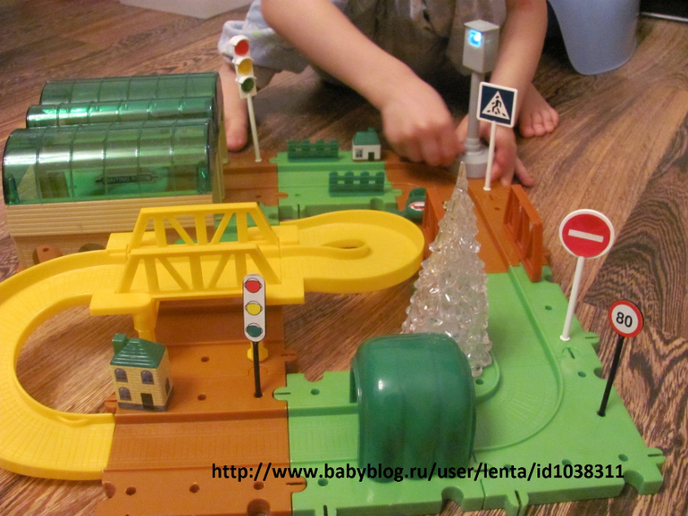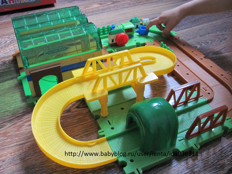 Покупала на 2 года ребенку. Достоинства - очень хорошее качество (хоть и Китай), несколько вариантов сборки, паровозик с прицепом (работает от одной батарейки ААА), различные дополнительные детали - туннель, мост (именно с ним ребенок выучил подъем и спуск), заборы, домики, и само депо с крышей, шлагбаум.
