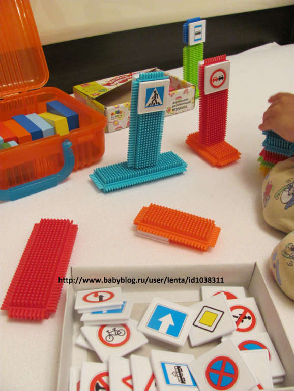 А еще мы цепляем на этот конструктор детали от лото - любимые знаки дорожного движения