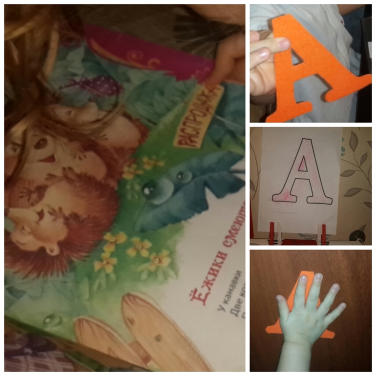 Затем нашли букву на магнитной доске и мольберте, раскрасили букву А , нашли ее в книге (почитали стихи), и поселили нашу "гостью" на дверь.