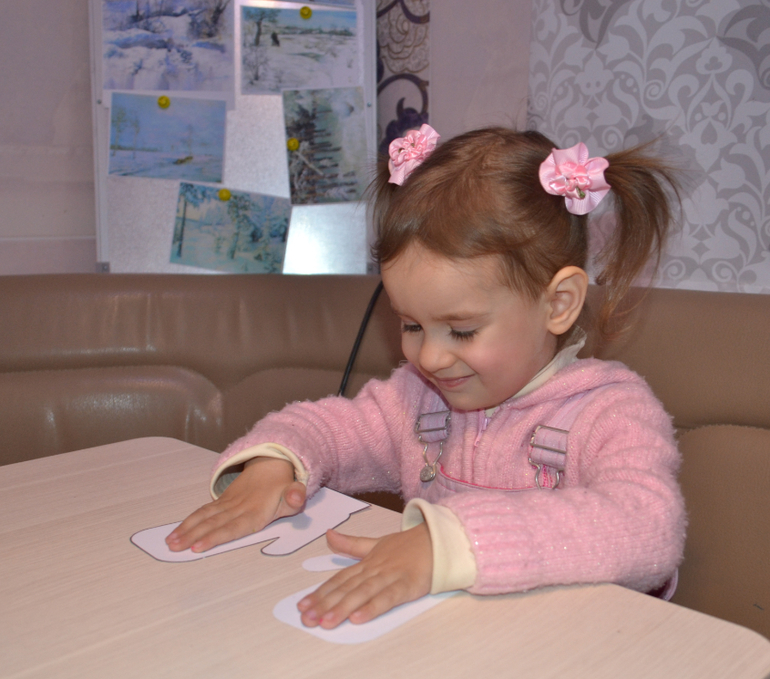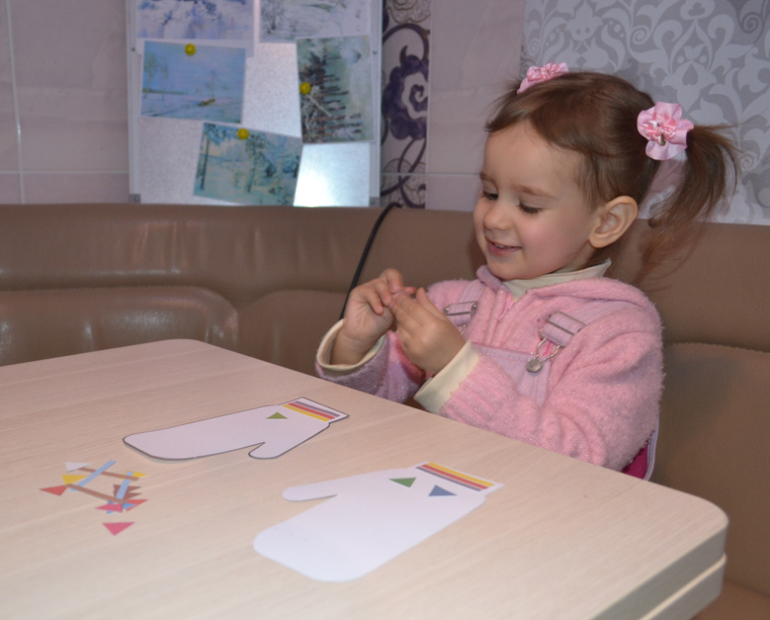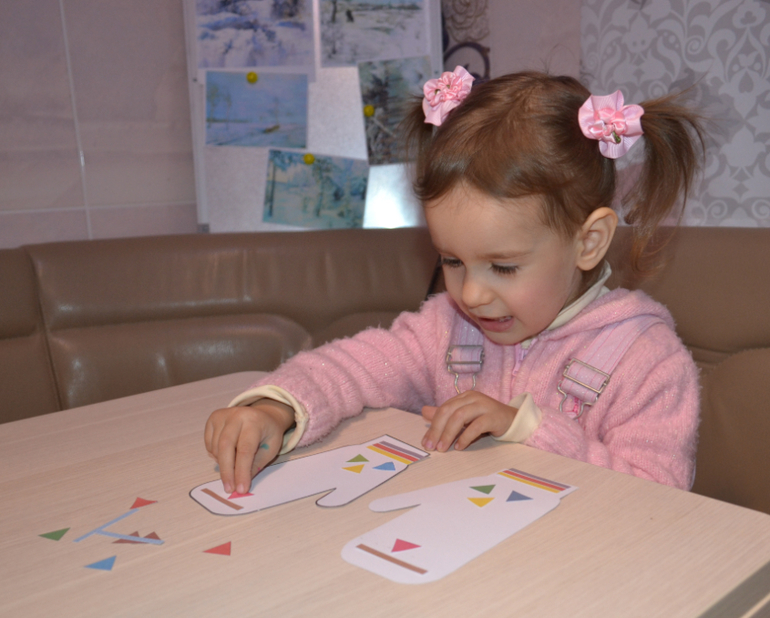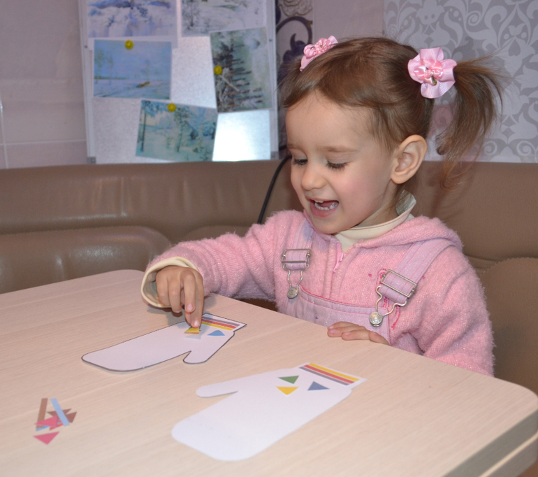Потом играли так - на одной рукавичке я выкладывала узор, а на другой - его воспроизводила Леонка)