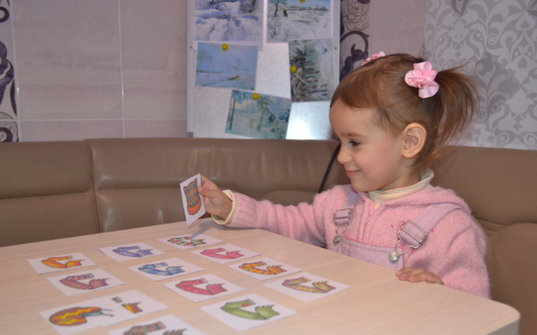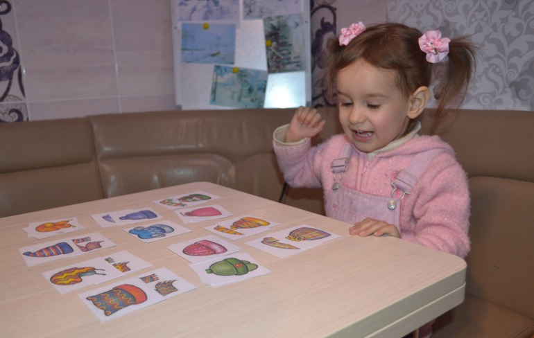 И третья манипуляция с игрой типа "лото" - подбор пары рукавичек... Но мы решили, что уже "старшие" (как выражается сама Лео) и можем попробовать более сложные вариации... К варежкам подбирали соответствующие по цвету носки, шапку и шарф)))