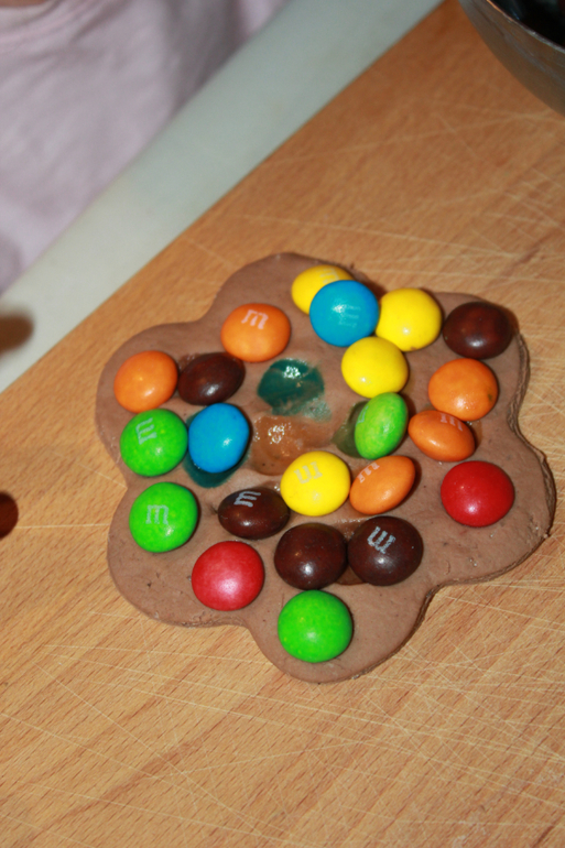 Я использовала свое соленое тесто с какао для цвета, т.к. для нас это расходный материал. M&M - он здоровский, но должна сказать предательски тает(((( Мы такое в жизни не едим, поэтому детям я сказала, что это бусинки)))