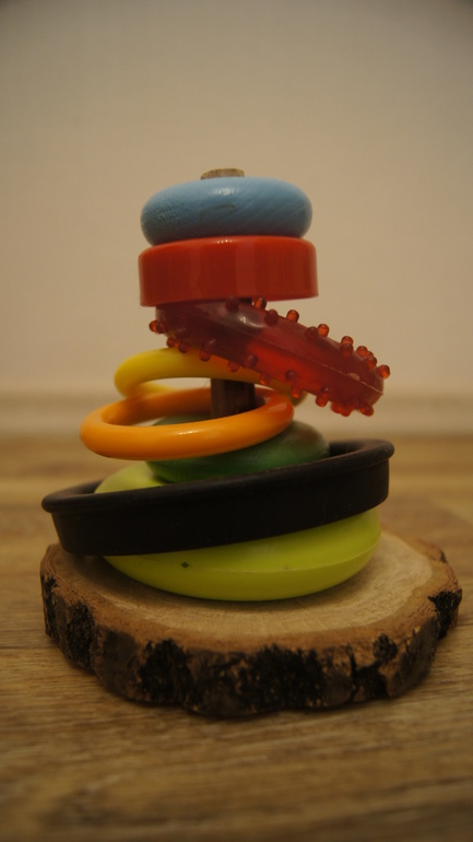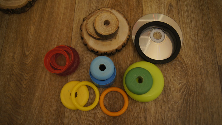 Решила немного разнообразить и сделать "креативную" приамидку. Пусть ребенок понимает что одеть можно не только колечки самой пирамидки, но и подставку от блэндера, диск, массажное кольцо и т.д.