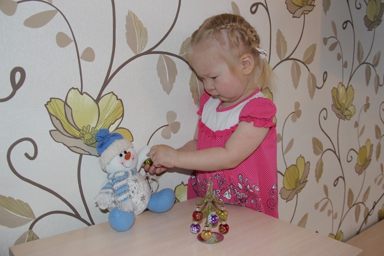 Снимали, одевали шары, потом искали пару по цвету, рассматривали снежинки, чем шары похожи и чем отличаются... Увлекательно..