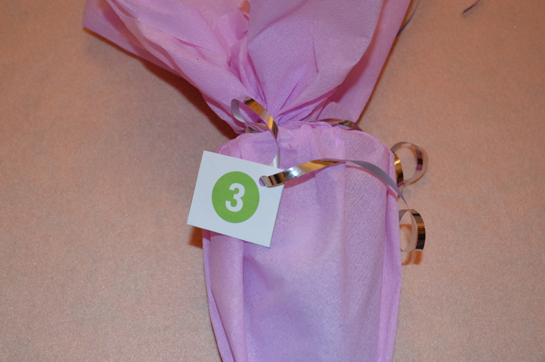 Но вернемся к изготовлению. Отрезаем кусок крепированной бумаги в форме квадрата со стороной примерно в 3-4 раза длиннее высоты стаканчика. Наполненный стаканчик ставим в центр, аккуратно собираем вокруг него бумагу в форме кулька. Завязываем бантик, предварительно надев на ленточку номерок
