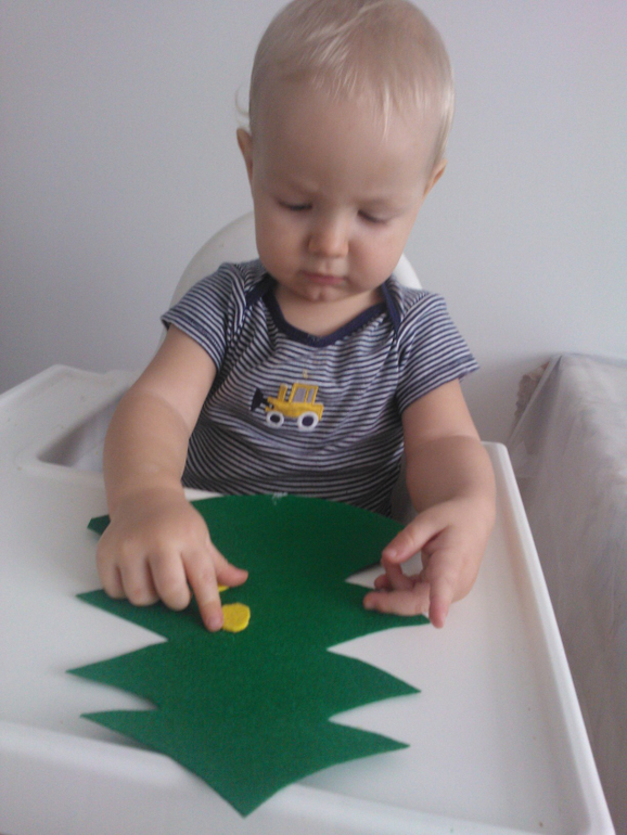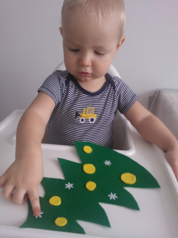 Это не пластилин)))) это аппликация из фетра. Я вырезала елку и другого цвета "шарики", мазала их клеем, давала ему, а он наклеивал. Сложностей не возникло))))А потом снежинки — это фигурным дыроколом сделала и тоже мазала — он клеил.