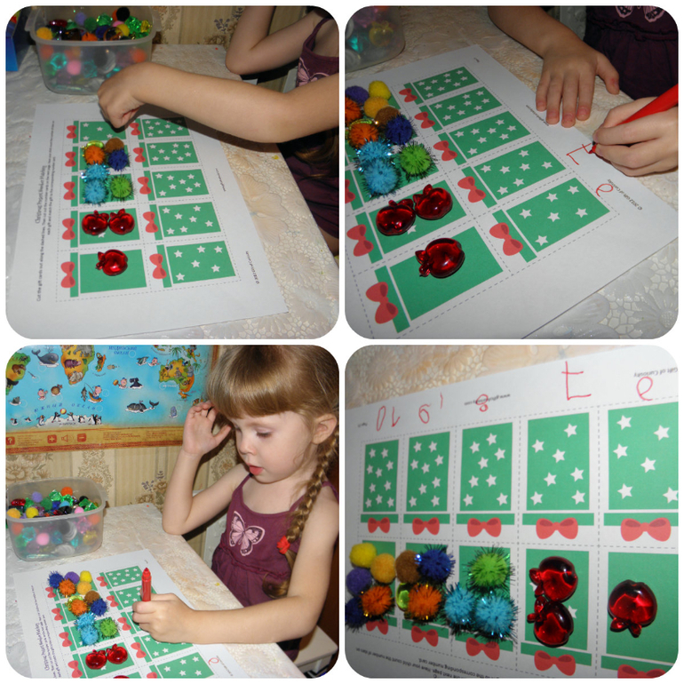 считали звездочки на подарочках, сначала выкладывали пампоны но после 5 , пампоны у нас не влезли, по этому Полина посчитала и подписала