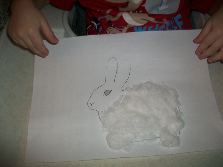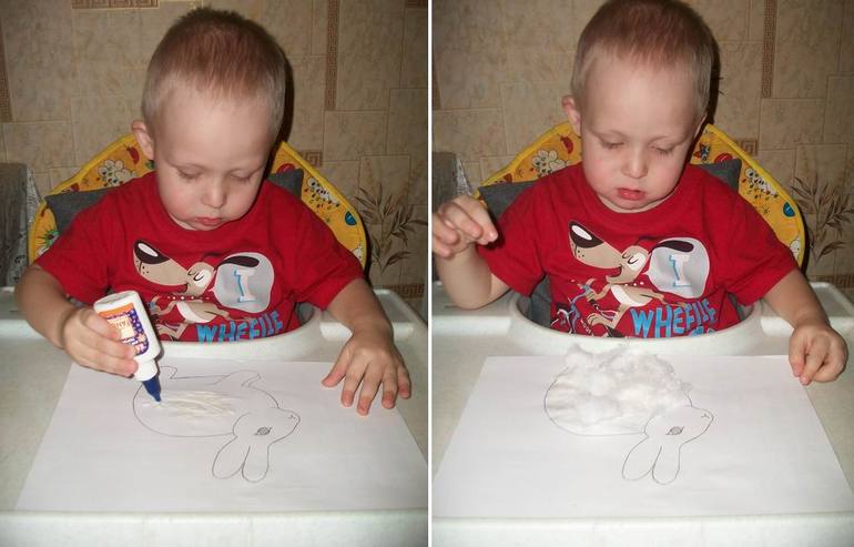 Клеили вату на клей ПВА. А клей через вату прилипал к рукам, и Максимке это не очень понравилось. Вместе доделали шубку.