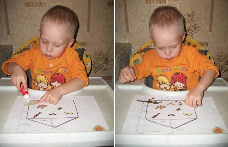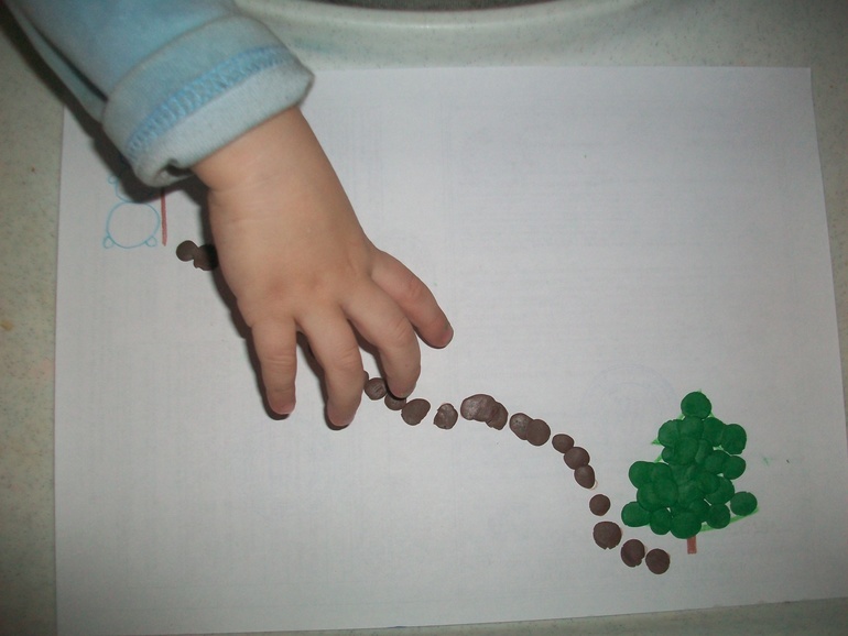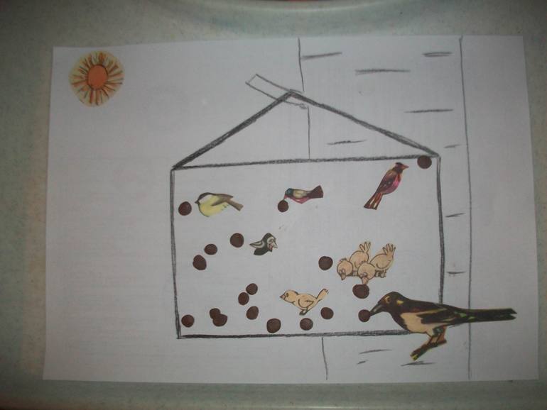 Нарисовала часть дерева с кормушкой, а Максим приклеивал на кормушку птичек. Потом еще и солнышко приклеил. Теперь нужно птичек кормить: пластилиновые зернышки как раз для этой цели подойдут!