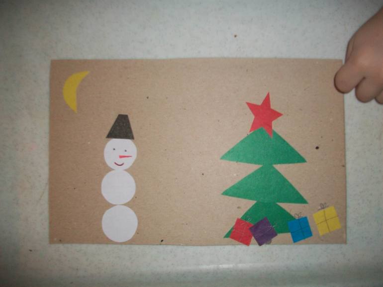 В первый раз учились клеить на клеем-карандашом. Максимке клеить понравилось: снеговик, ёлочка, шапка-ведро у снеговика, подарки под ёлочкой, а еще луна.
