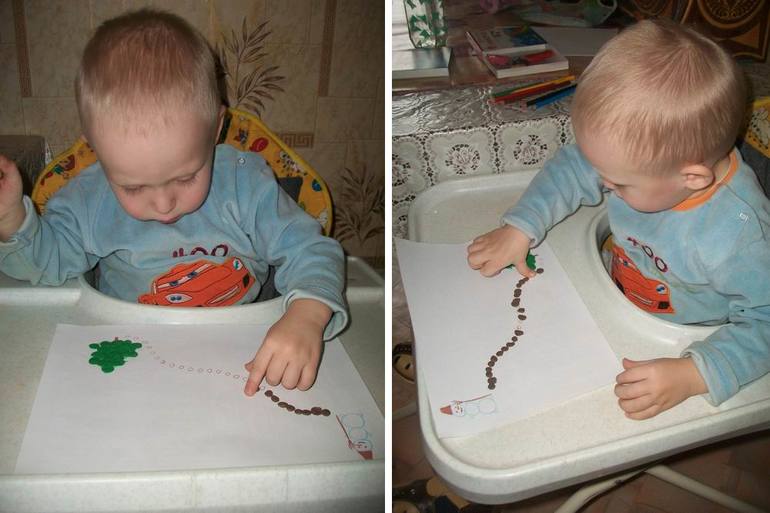Сначала облепили контур ёлочки зелёным пластилином, а потом сделали дорожку для снеговика, чтобы он не заблудился