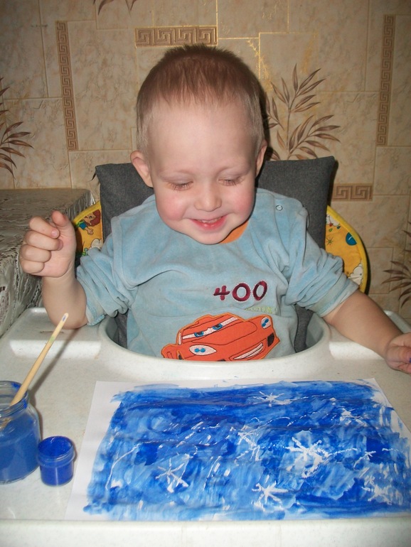 Свечкой нарисовала снежинки на бумаге, а потом синей краской мы эти снежинки проявляли. Максим мазал краской совсем мало, не захотел, так что я сама показывала ему, где же там на бумаге спрятались звездочки. Зато итог его очень обрадовал!