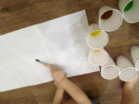 3. В пустых стаканчиках смешивали цвета, то есть вместе попытались повторить элементы радуги. Смотрели и изучали пропорции опытным путем, когда цвет становился светлее или темнее (при получении зеленого, добавляем больше синего или льем синюю воду - получаем более темный зеленый).