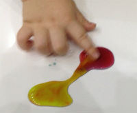 4. Стали-таки рисовать на бумаге. Светлые цвета были почты не заметны, поэтому мы плавно перешли на "капание". Капали большие лужицы и уже в них миксовали цвета, наблюдая процесс. Лучше это делать на поверхности, кот. не впитывает влагу, мы перешли на доску для лепки.