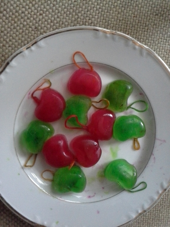 А завтра еще новогодний праздник в нашем районе. Все, кто придёт с украшением для ёлочки, получит приз.Мы приготовили вот такие яблочки из цветного льда
