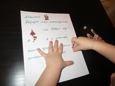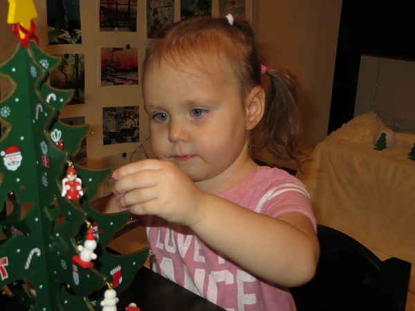 7. Наконец, добрались до Деда Мороза. Вручили письмо. А он для Яночки передал деревянную елочку с игрушками и подарок (Новогоднее лото)