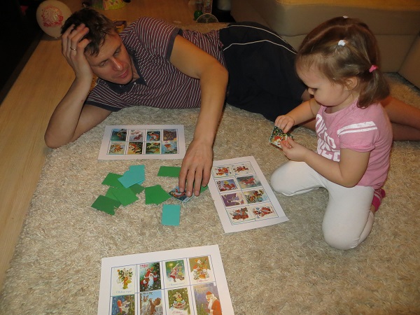 И с азартом всей семьей поиграли в лото. Папа все время выигрывал, но Яночка этому искренне радовалась. Кричала "Ура! Папа чемпион."Лото делала сама из открыток Зарубина. Кому надо, пишите, с удовольствием поделюсь.