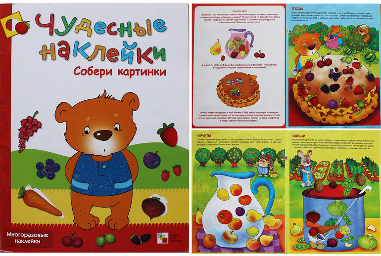 На первой страничке помогаем мишке наклеить ягоды для пирога, на второй странице делаем фруктовый компот, на третьей странице варим овощной суп.