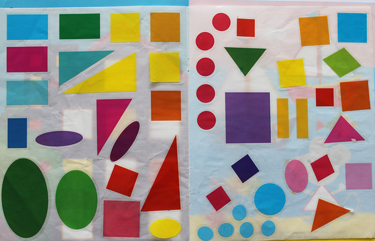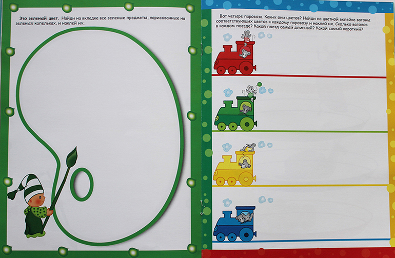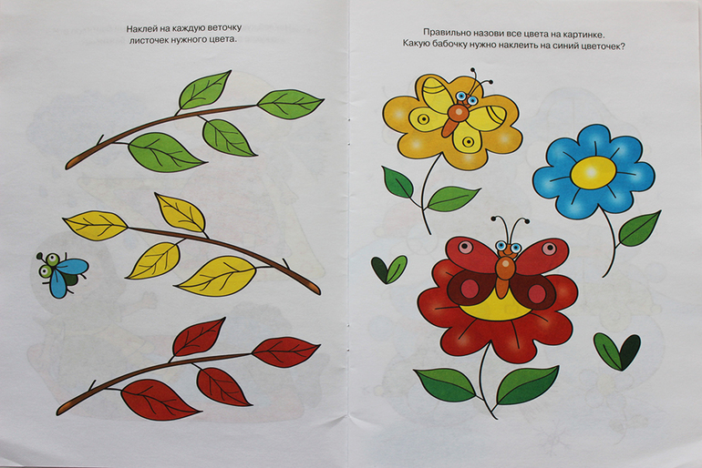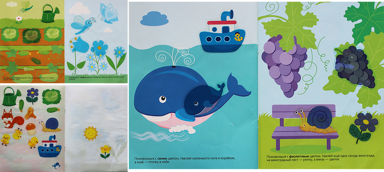 В игровой форме можно закрепить знания о базовых цветах (красный, оранжевый, желтый, зеленый, голубой. синий, фиолетовый), а так же приклеивая наклейки придумывать разные истории и сюжеты.