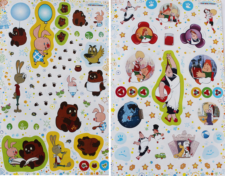 Собственно эти наклейки были куплены из-за Винни Пуха, у нас сейчас мания по нему (Саше 2 года 1 мес), жаль, что еще Леопольда тут нет, его тоже, он очень любит.