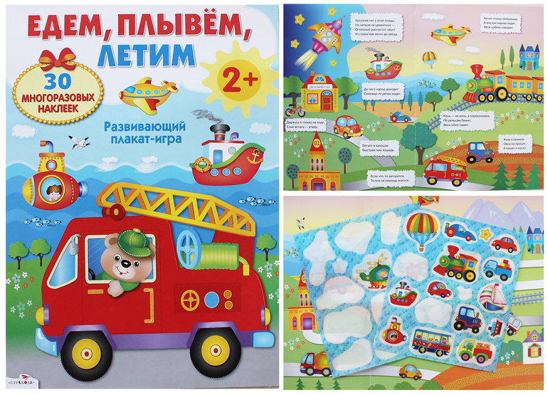 Плакат большого формата, у нас он прям на весь икеевский столик (можно при желании и на стену повесить), картонный, глянцевый, наклейки многоразовые, отклеиваютя отлично, бумагу не рвут. На наклеечный вкладыш обратно приклеиваются хорошо, в трубочку не сворачиваются.